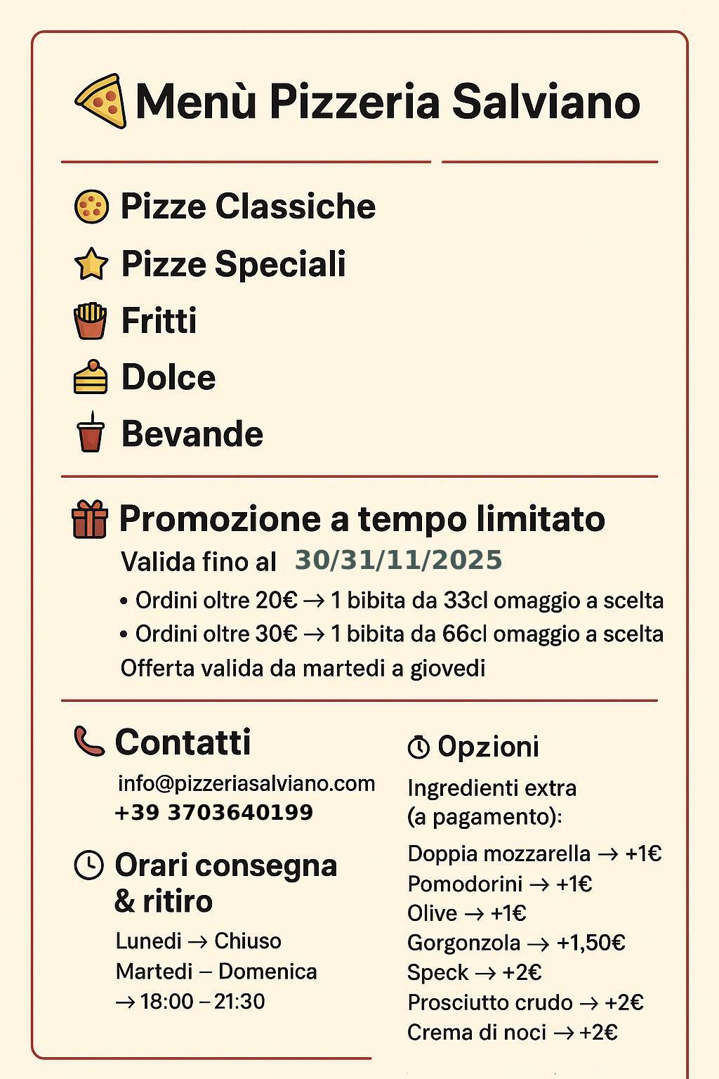 Alla Pizzeria Salviano, non troverai solo pizza: offriamo anche un’ampia scelta di bevande analcoliche e alcoliche, dalle birre artigianali alle bibite più amate, per accompagnare al meglio ogni pasto. L’ambiente è semplice ma accogliente, perfetto per una cena tra amici o una serata in famiglia.